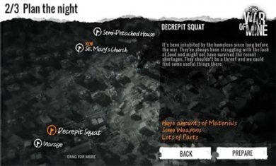 黑夜(21:00到5:00)大部分地区的战争都会停息(有些地方有几率陷入交战状态或暴雪,无法进入,大概8—10天),玩家可以趁这段时间操纵角色去其他区域的废墟搜寻物资,不同的地方,物资种类的多少也不同,有些区域会存在幸存者,如果玩家露出武器或者进入禁区会遭到幸存者的警告以及攻击,偷窃幸存者私有的物资也会遭到警告以及攻击(只要没被发现,就不会受到警告和攻击。比如关着门在里面偷),也有些幸存者愿意同玩家交易。也有可能遇见土匪,有的土匪一旦看见玩家所操纵的角色就会进行攻击,几乎所有土匪都持有枪支,玩家难以正面杀死土匪。