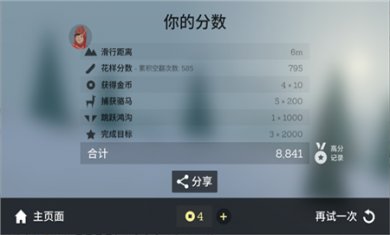 如果操作失败摔倒了,那么起身也需要花费一定时间,这样就会影响最终分数。所以如果想要使用后空翻的动作,那么要选择下坡的位置,这样成功的可能性会更大。并且在滑行的路上,会有很多的障碍物。玩家需要点击跳跃,才能够躲避这些障碍物。