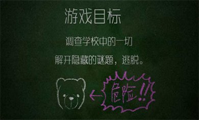 1、进入到游戏之后,我们需要环绕四周,先向后转,有一面黑板。黑板上写着:要我们搜索整个学校,找出隐藏的秘密然后逃出去,最后提醒我们泰迪熊非常危险。