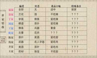 -世家方面:举办/参加宴会就好,有耐心就按表来,没空就只办宴会,荤素搭配,口味适中,重金花钱就完了。