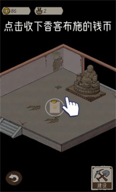 2、耐心等待香客进入天王殿内,面对破烂不堪的天王殿内部,可以点击【建设】按钮来改善天王殿的环境。