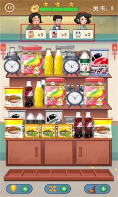 3、独特的三消玩法,根据上方不同顾客的要求,在满满的货架中找到相应食品吧