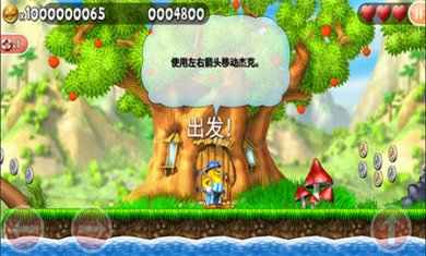 1、左边的两个按键分别控制前进和后退,右边的按键控制跳跃,按两下则是二段跳,杰克有3颗爱心,碰到虫子等怪物会消耗爱心。